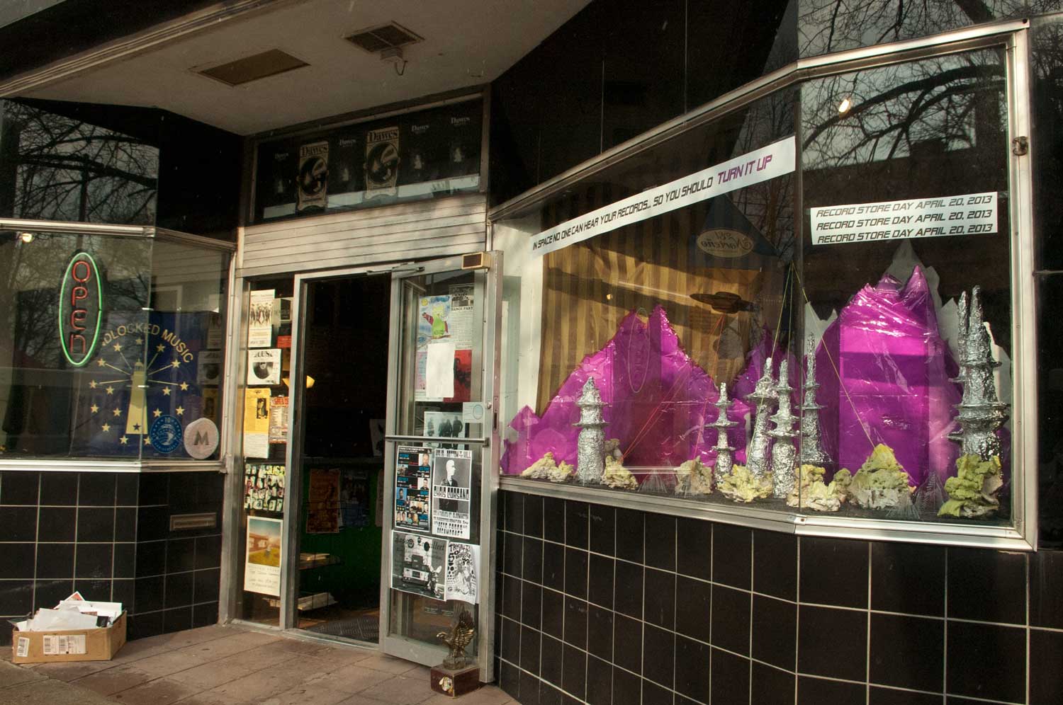 Together, Kelly Novak (metalsmith and sculptor extraordinaire) and Bill Pariso (glaze boffin and ceramic genius) got together and designed this window for World Record Store Day 2013. “In space no-one can hear you scream…so you should TURN IT UP!”