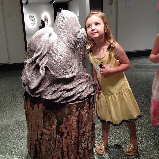 Kali from Harmony School is listening to the sounds I recorded, of tailgaters making “whooping” noises. These are emanating from the Wolf Head sculpture, and are intended to blur the boundaries between what is human and what is animal.