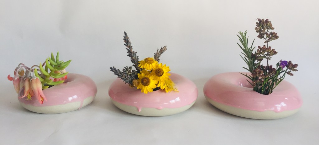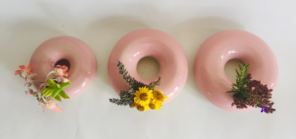 So I have been making these donuts to celebrate Victoria getting out of lockdown…starting with the simple pink and white vase versions…and moving onto a more jazzy donut with sprinkles…which is on a darker clay. I like the dark clay contrasting with the lighter colours on the top. Next stop: chocolate!