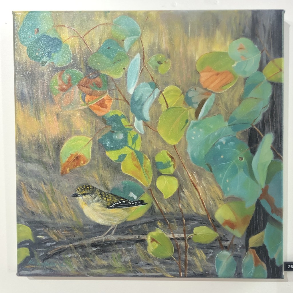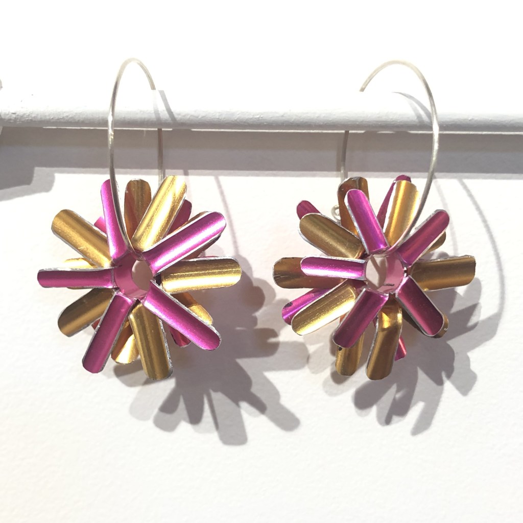 The show had other wonderful artists in it: Selby Ginn with beautiful tartan-like watercolour explorations of colour and depth, perhaps gentle rug colour schemes. Libby Noblett made beautiful re-upholstered picnic chairs using her wonderful screenprints, as well as creating cushions and a picnic umbrella! Karen Holland painted beautiful luscious foodscapes and birdlife and Lisa Kearns made wonderful bent and shaped floral earring and brooch pieces, reclaimed from anodised aluminium picnic cups and straws. It was curated by the wonderful Amy Carr-Bottomley who is also a tremendous textile artist.