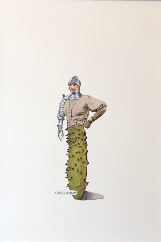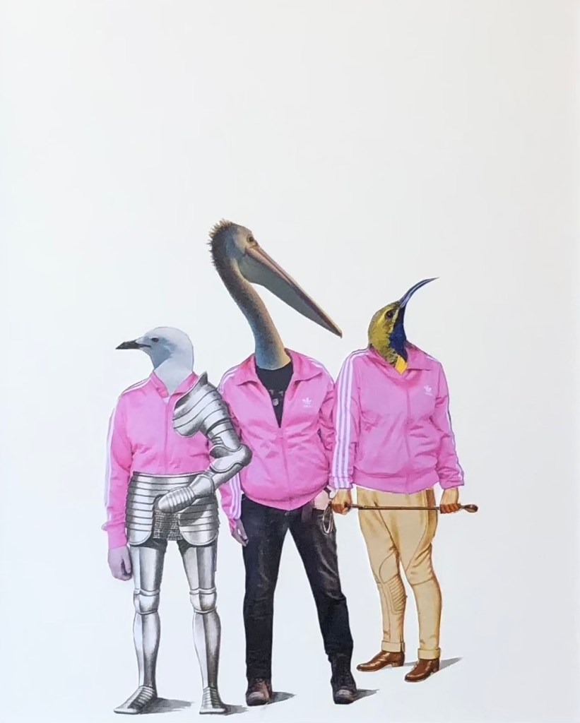 The title is based on the French origins of the word collage, mashed up with the French question “Quel âge as-tu?”, in English “how old are you?”, referring to myself, an older parent trying desperately to stay young through her art practice. I use humour to interrogate my own attitudes: to parenting, to sport, to social interactions and cultural trends. Anthropomorphism, symbolism, narrative-based work and popular culture often feature in my artwork.