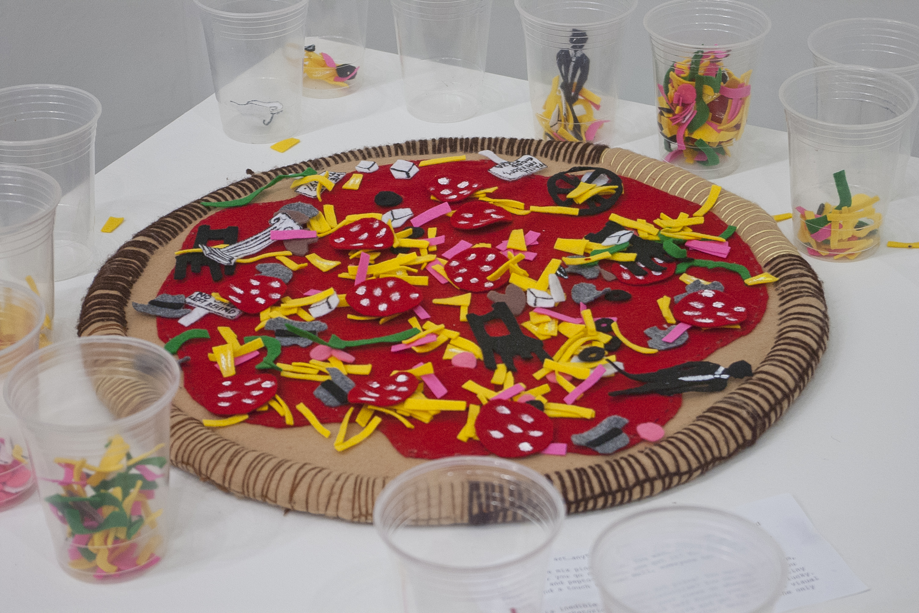 Visitors to the exhibition could customise the pizza in the style of the imaginative children’s fuzzy felt game.